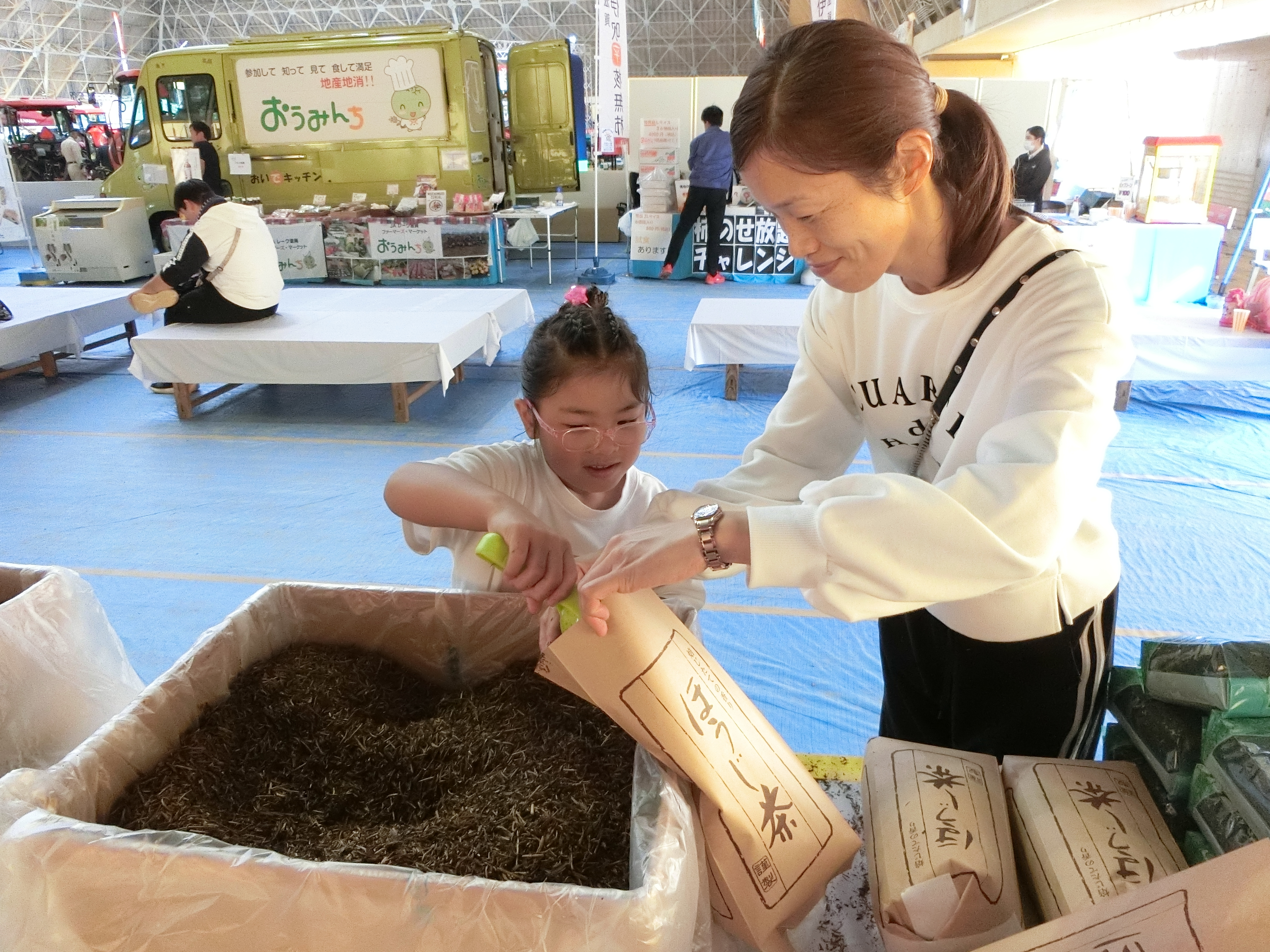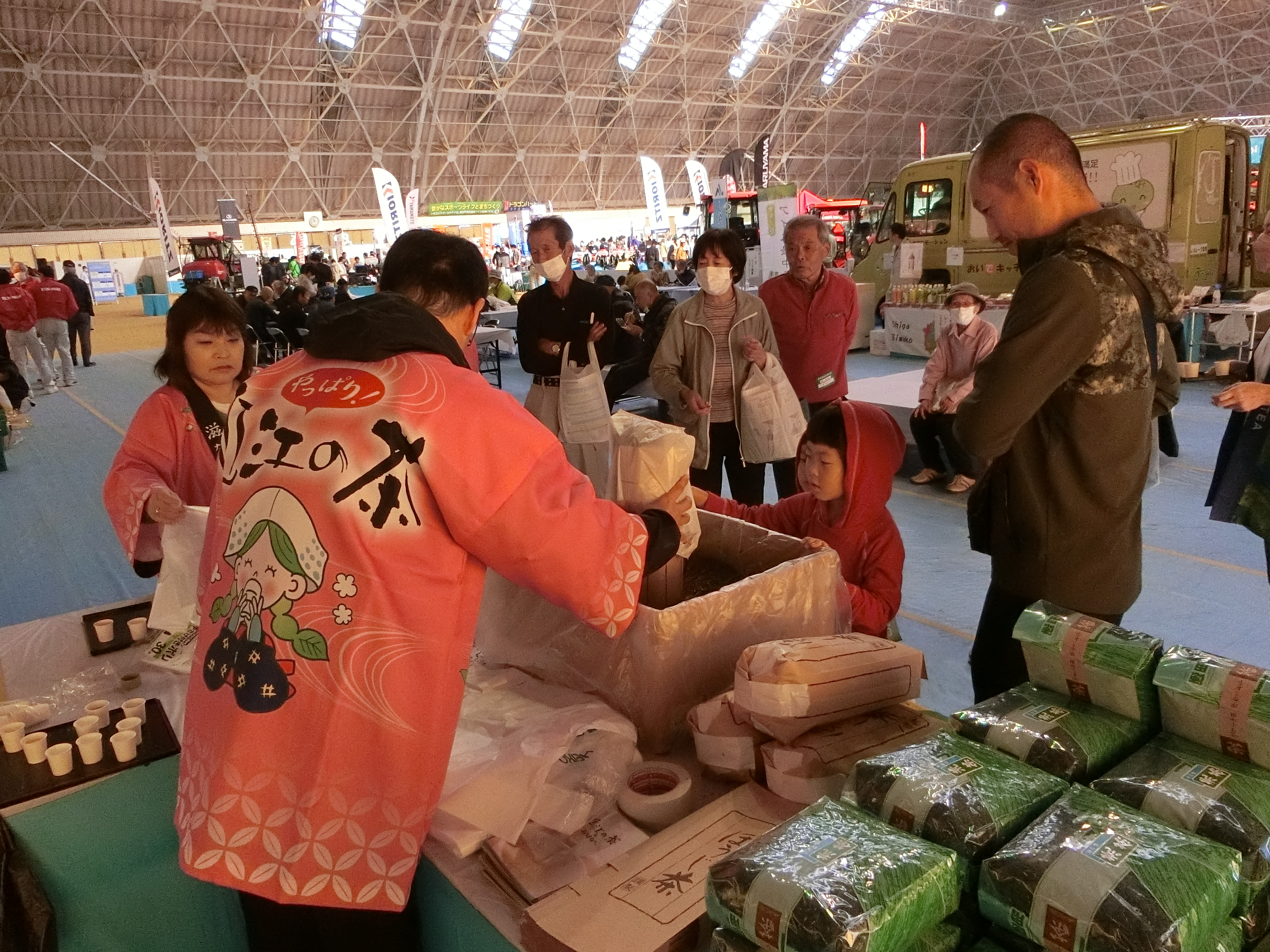 11月2日、3日、4日の3日間恒例の全農滋賀県本部主催の農業機械大展示会が、竜王町ドラゴンハットで開催され、茶業会議所は近江の茶のPRの為、JAこうかと共に参加をしました。当日は、農機具の展示のほか、営農相談コーナー、食味測定、肥料農薬コーナー、最先端の農機の実演も実施され多くの農家をはじめ、農業関係者の来場があった。滋賀県茶業会議所では、この機械をとらえ、水出し煎茶、ほうじ茶の詰め放題など、近江の茶を堪能していただける取り組みをさせていただきました。