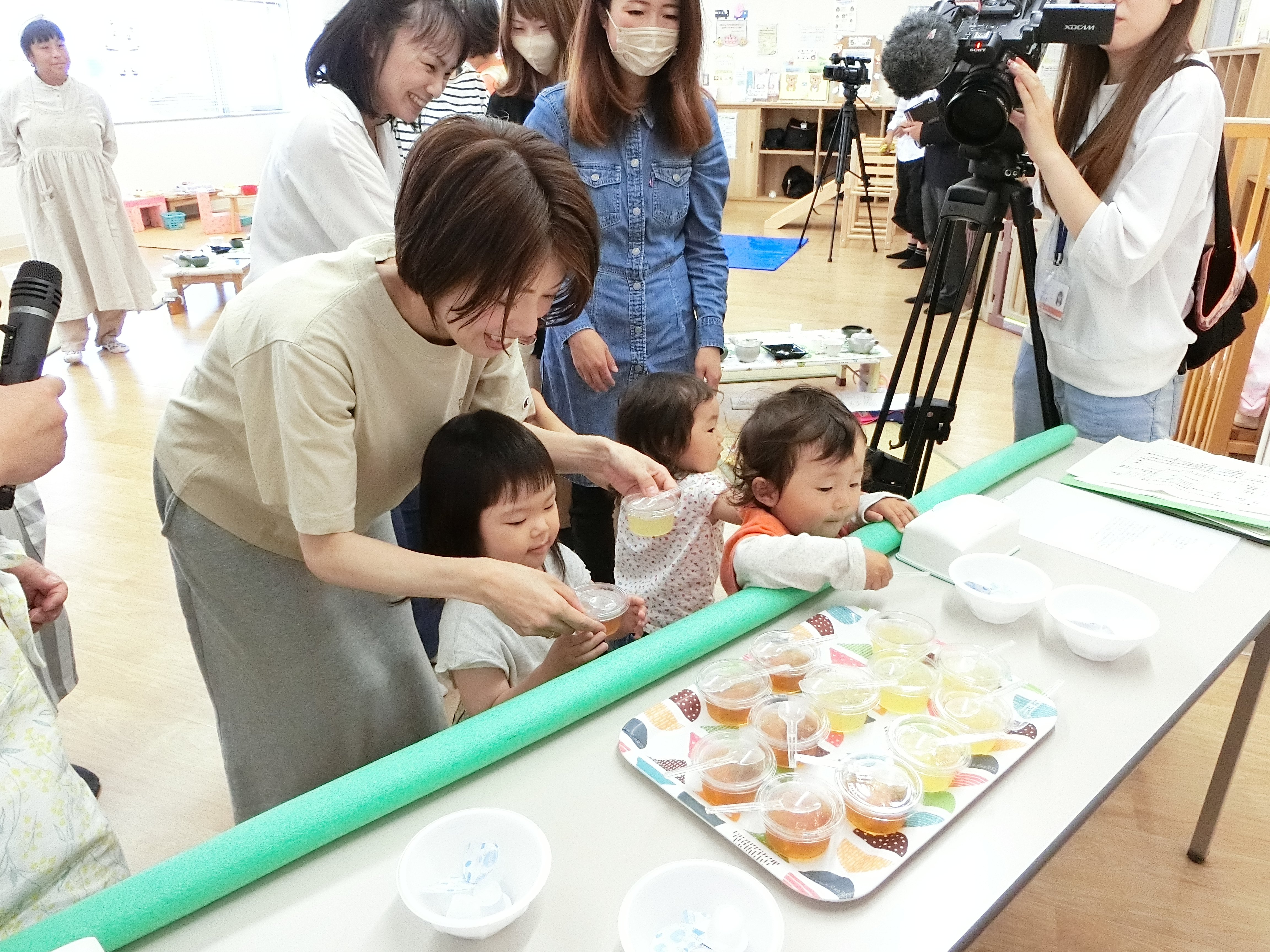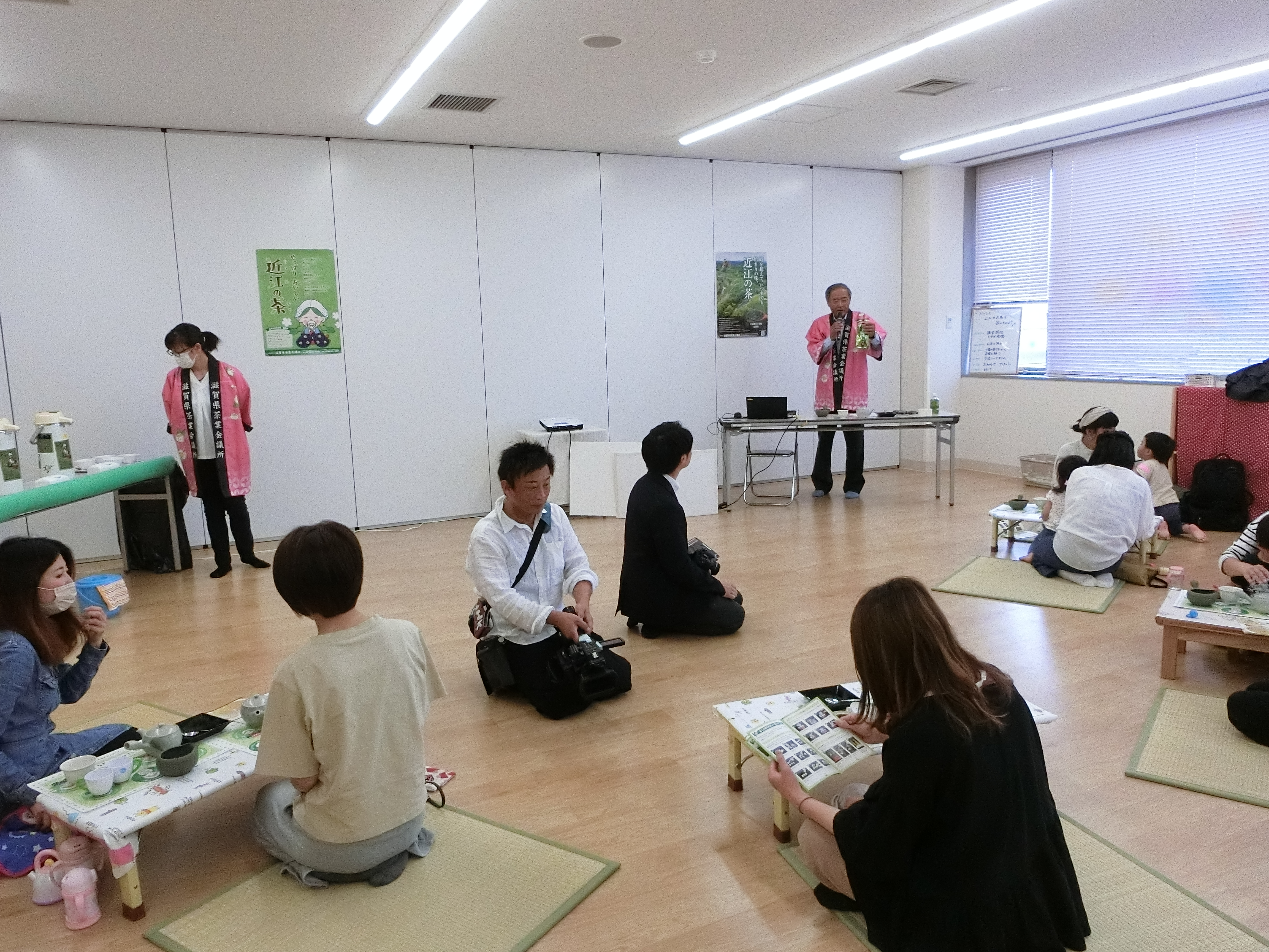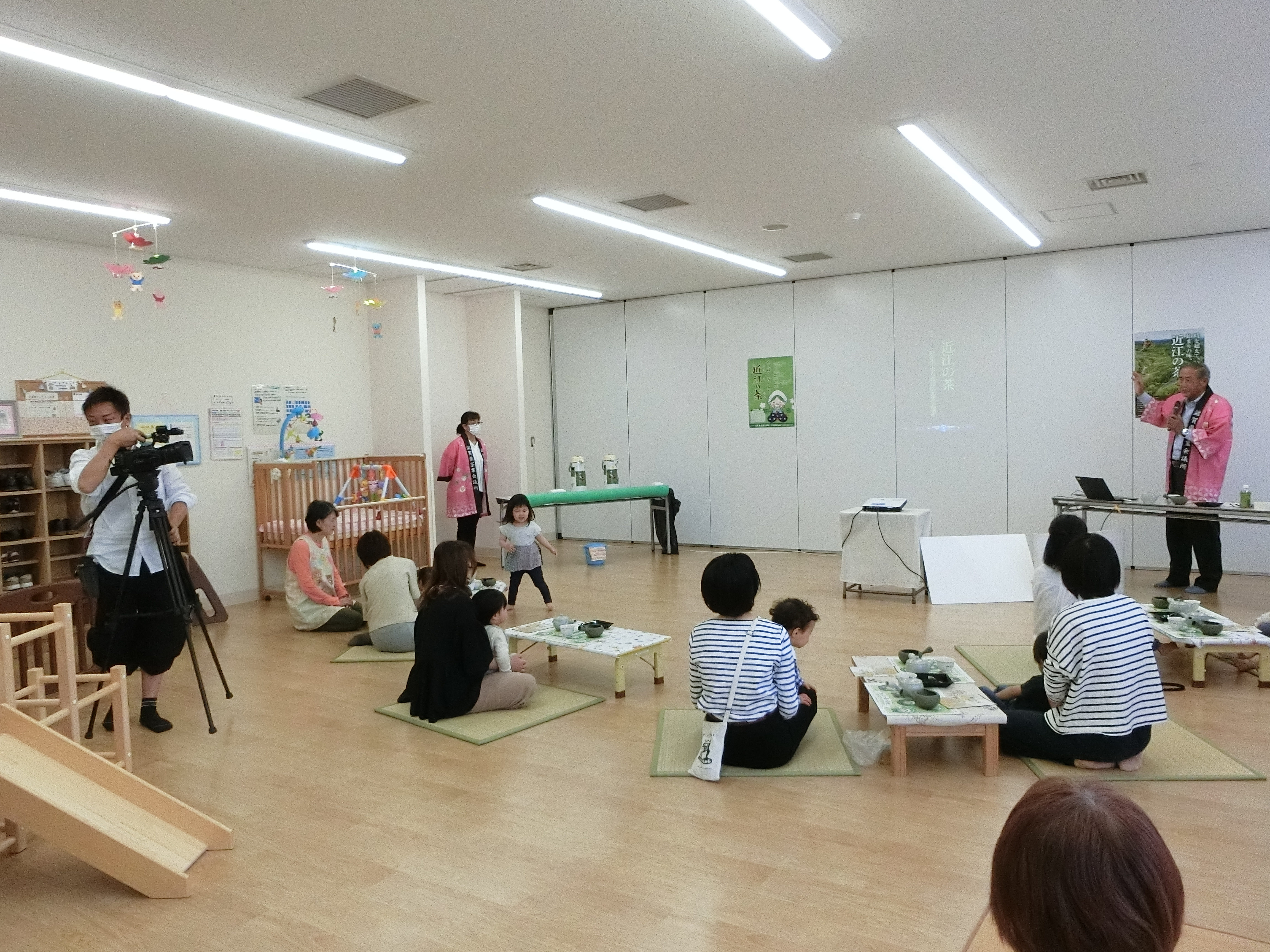 お茶好きのお母さんには、伝教大師最澄が、中国(唐)からお茶の実を持ち帰り、日吉大社付近に蒔いたのが始まりとされる歴史書の紹介、県内のお茶の産地、お茶の種類や効能などビデオを使って紹介し、興味深く聞いていただきました。そして、実際に淹れ方の説明をしながら、土山のかぶせ茶を急須で淹れて味わっていただきました。「家で淹れて飲むのと全然違う。ほんとに美味しい」と感想を言っていただきました。また、水出しのかぶせ茶、無農薬ほうじ茶の水出しも用意し飲み比べていただきました。ほうじ茶の水出しの場合カフェインも少ないことから、「夏場に向け子供と共に毎日飲もう」と普段と違うお茶に大きな関心を持っていただきました。