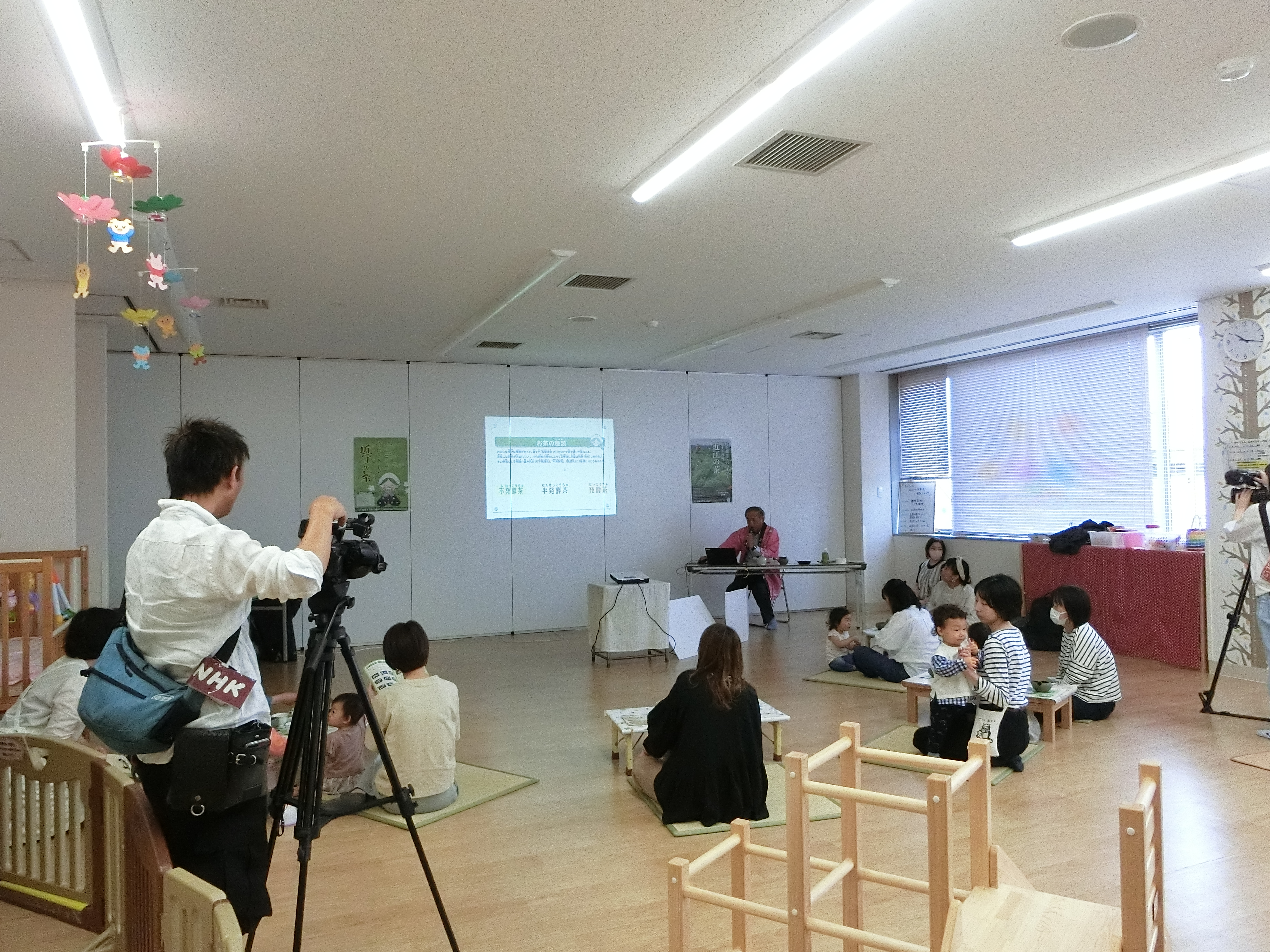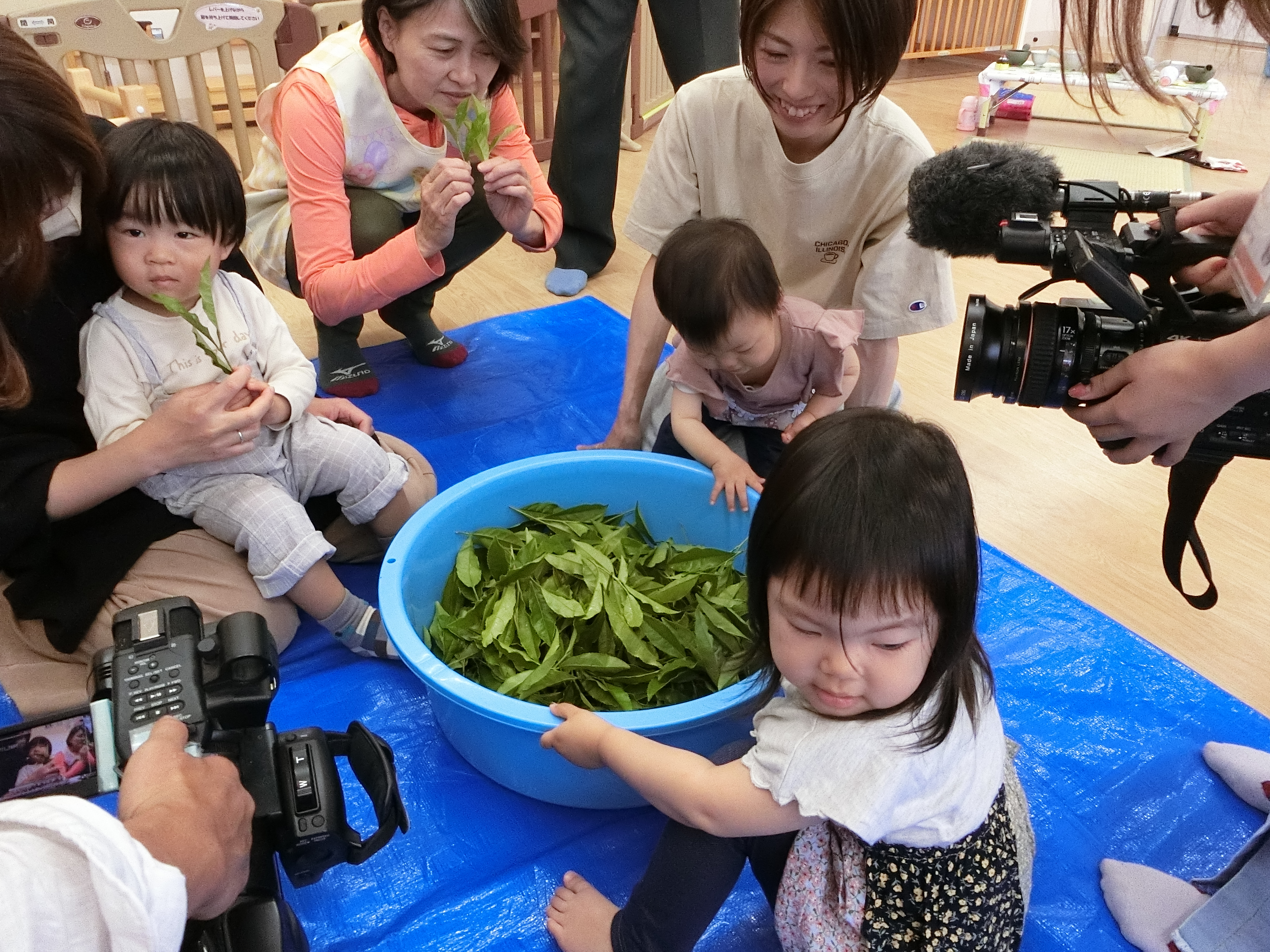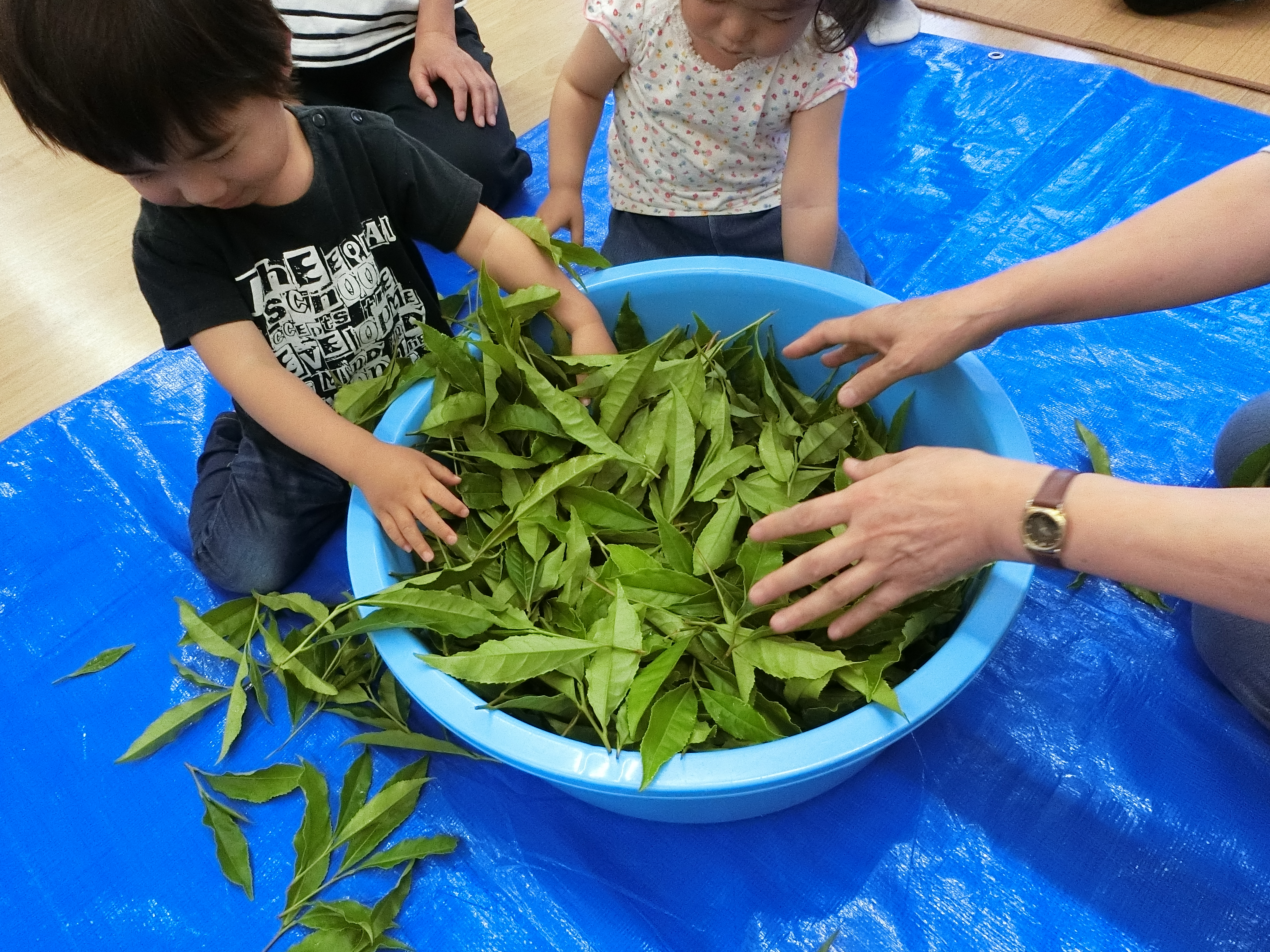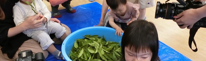 3歳未満の子供たちも含めての講習会ということで、初めての取り組みであることから、サポーターの方も駆けつけていただいての取り組みとなりました。子供たちの遊びということで、当日無農薬栽培の茶園から茶葉6Kgを収穫し,直に触って遊べる体験を取り入れました。狙いは的中し、茶葉をつかんだり、投げたりと楽しく遊んでくれました。