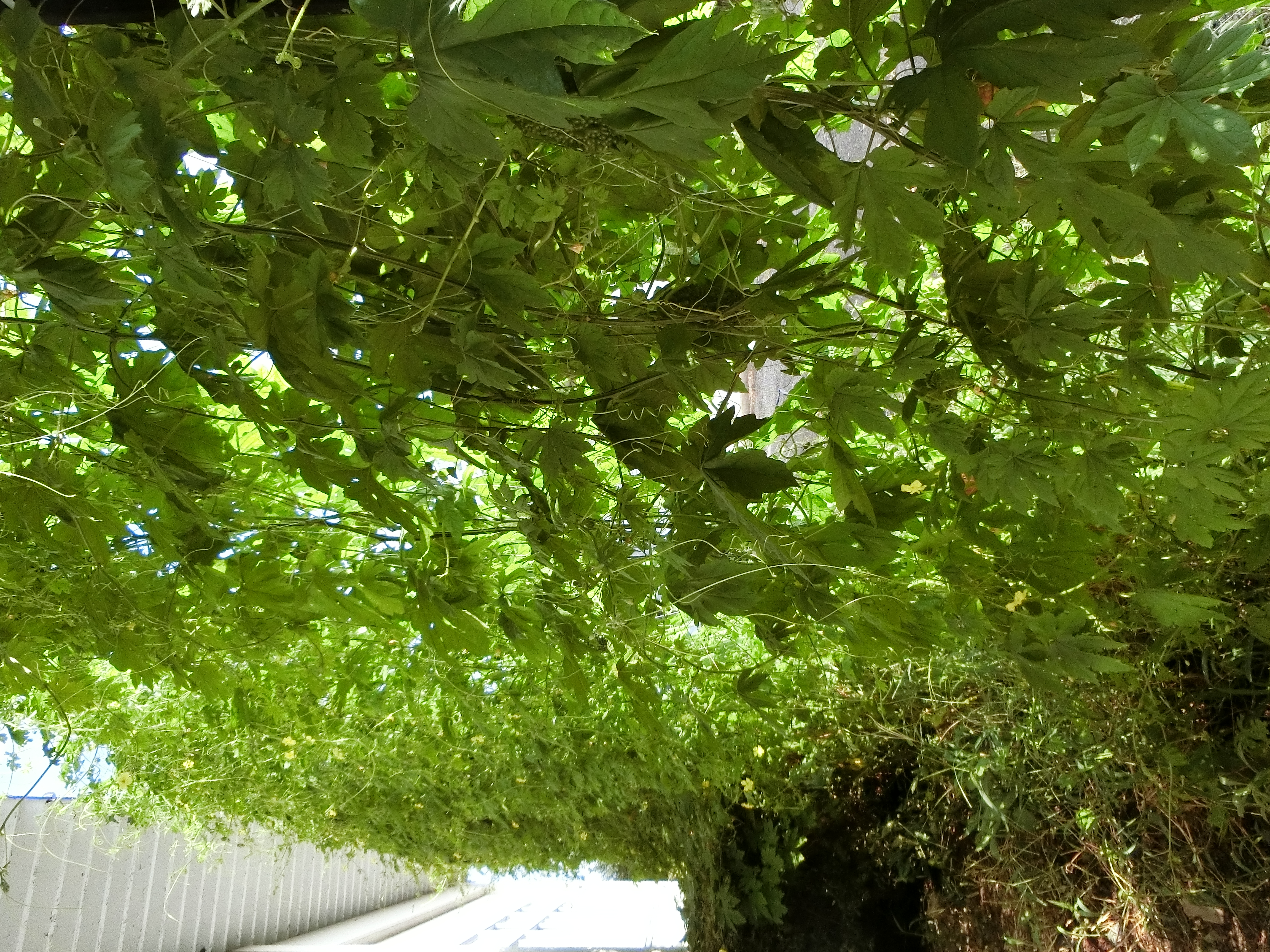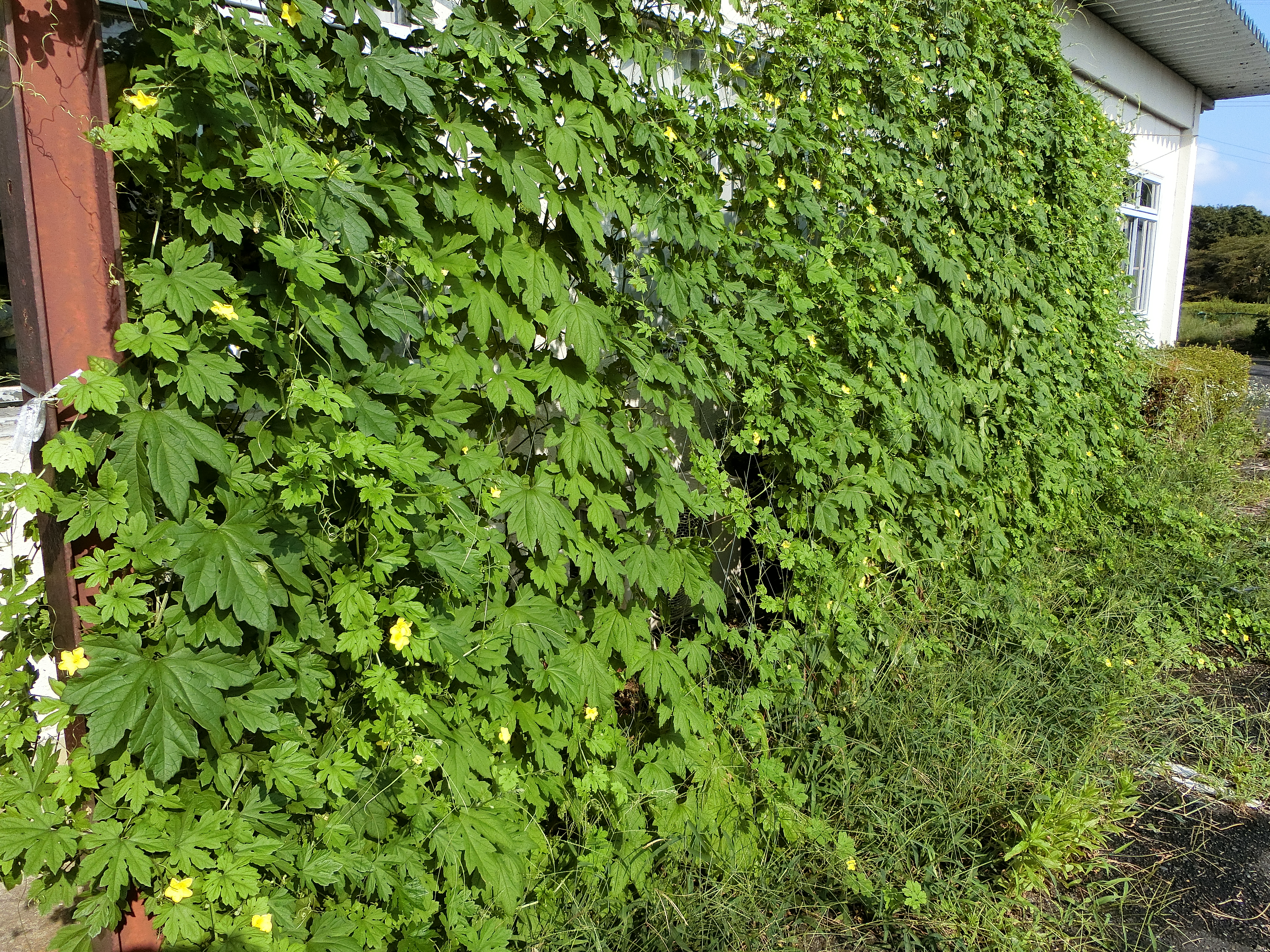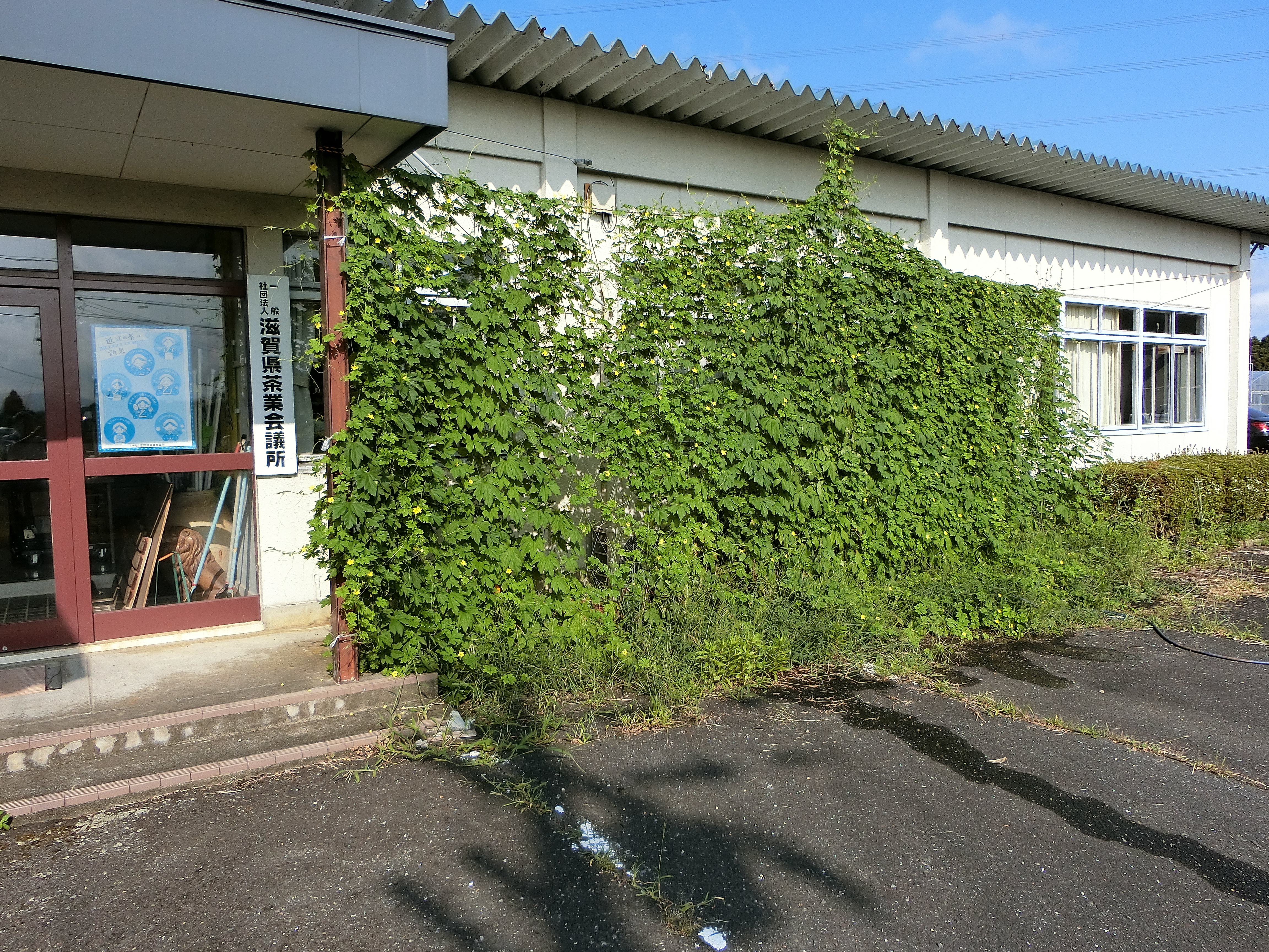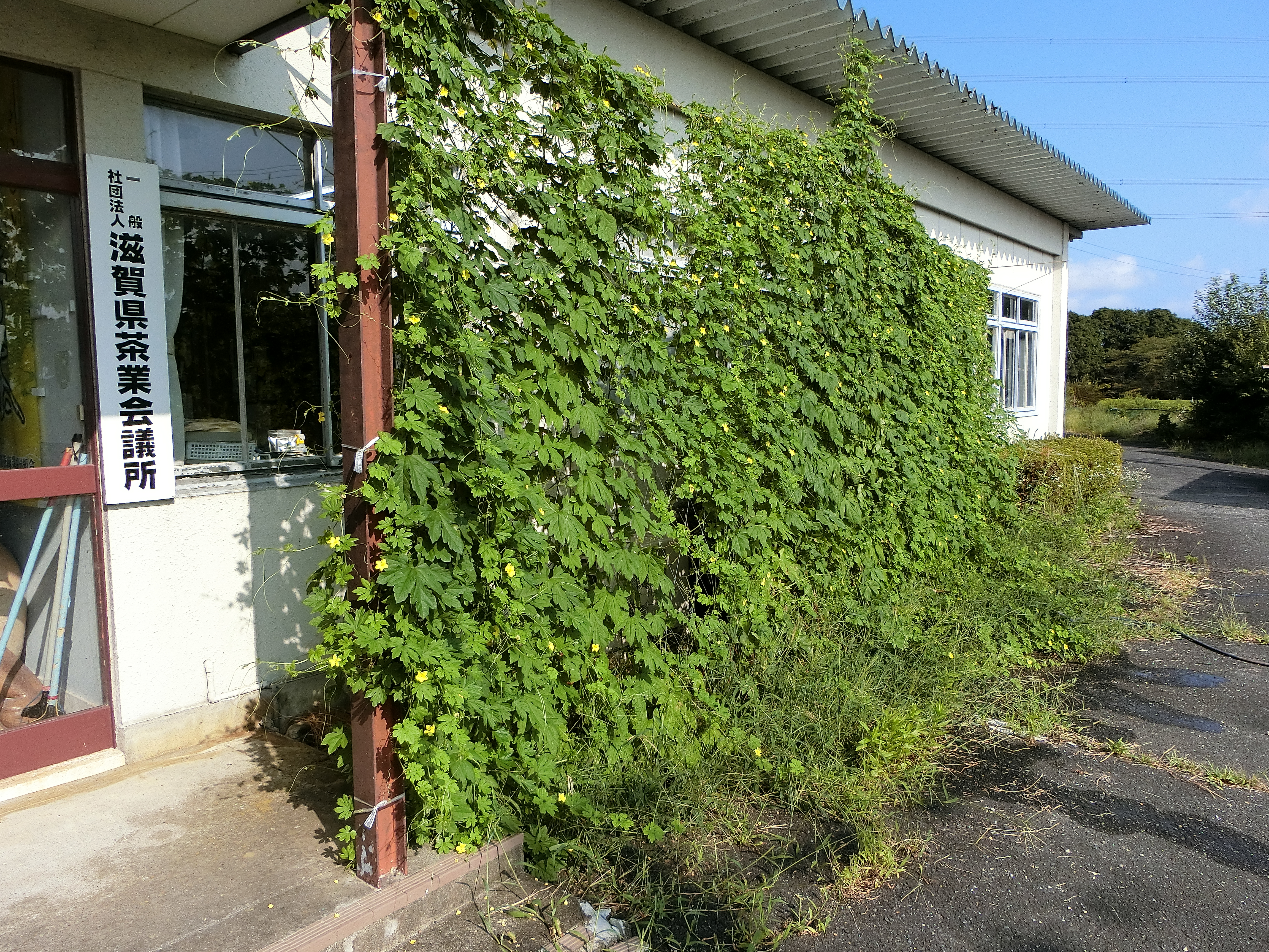 毎年、前年にこぼれた種からゴーヤが目を出し、水を少しやるだけでものすごい勢いで成長します。それが、本年は、気候がちょうど合ったのか例年にない勢いで成長しました。おかげで、太陽光はほとんど入らず、お客さんも窓から見えず、すごいカーテンとなりました。例年にない暑さ、このカーテンのおかげでエアコンの効きも良く、覆いに省エネにつながりました。しかし、ゴーヤはほとんど実をつけませんでした。