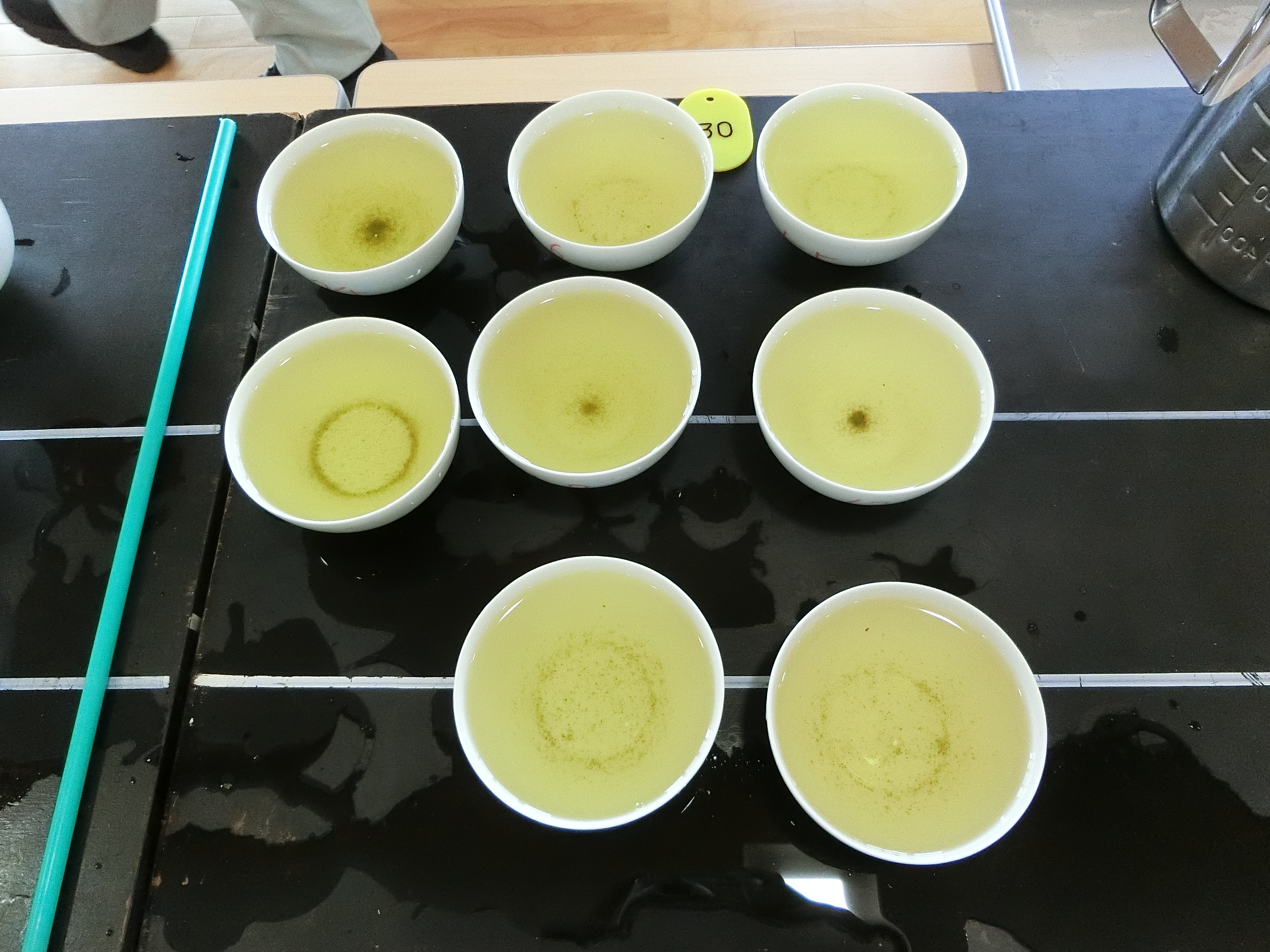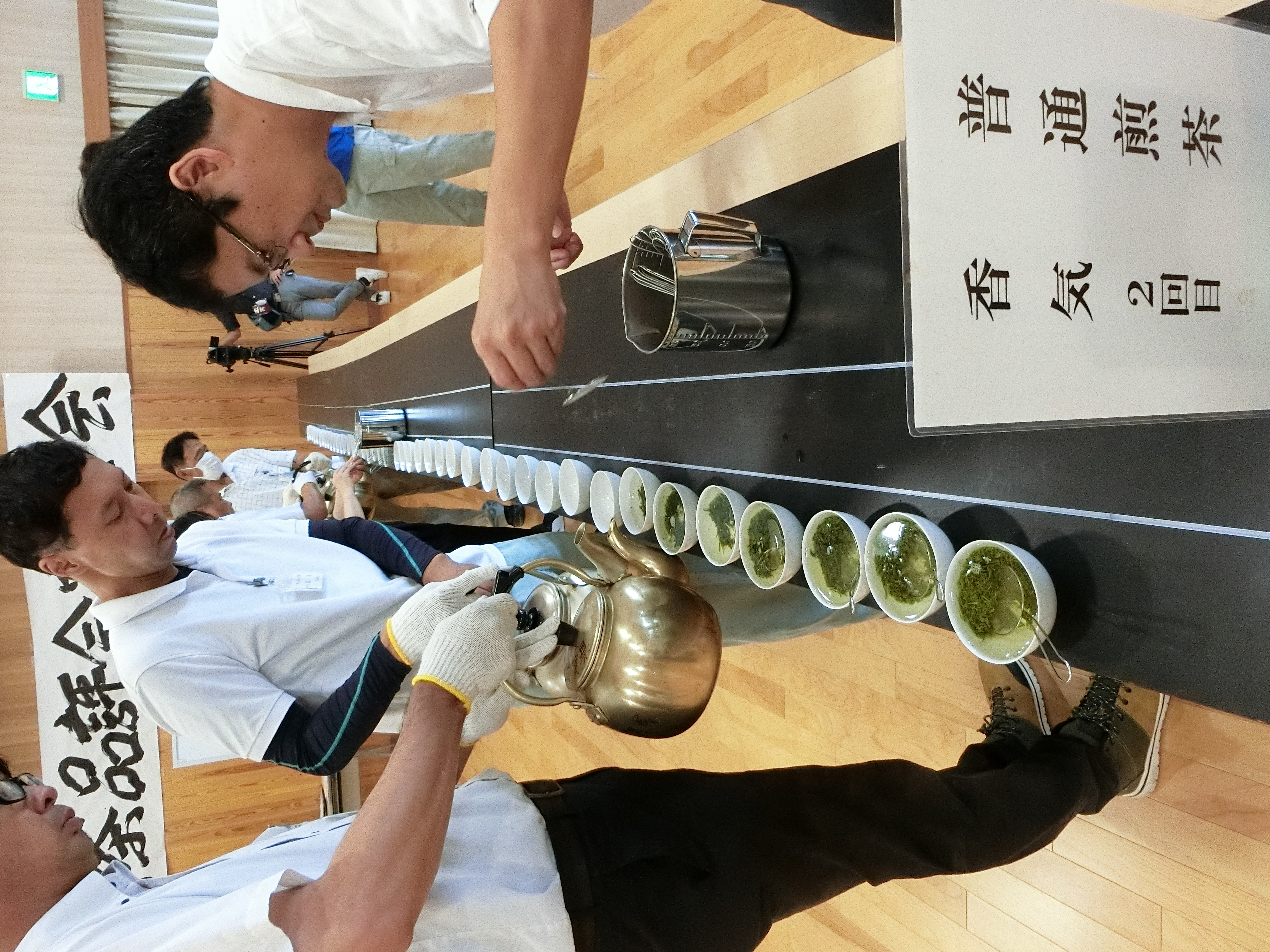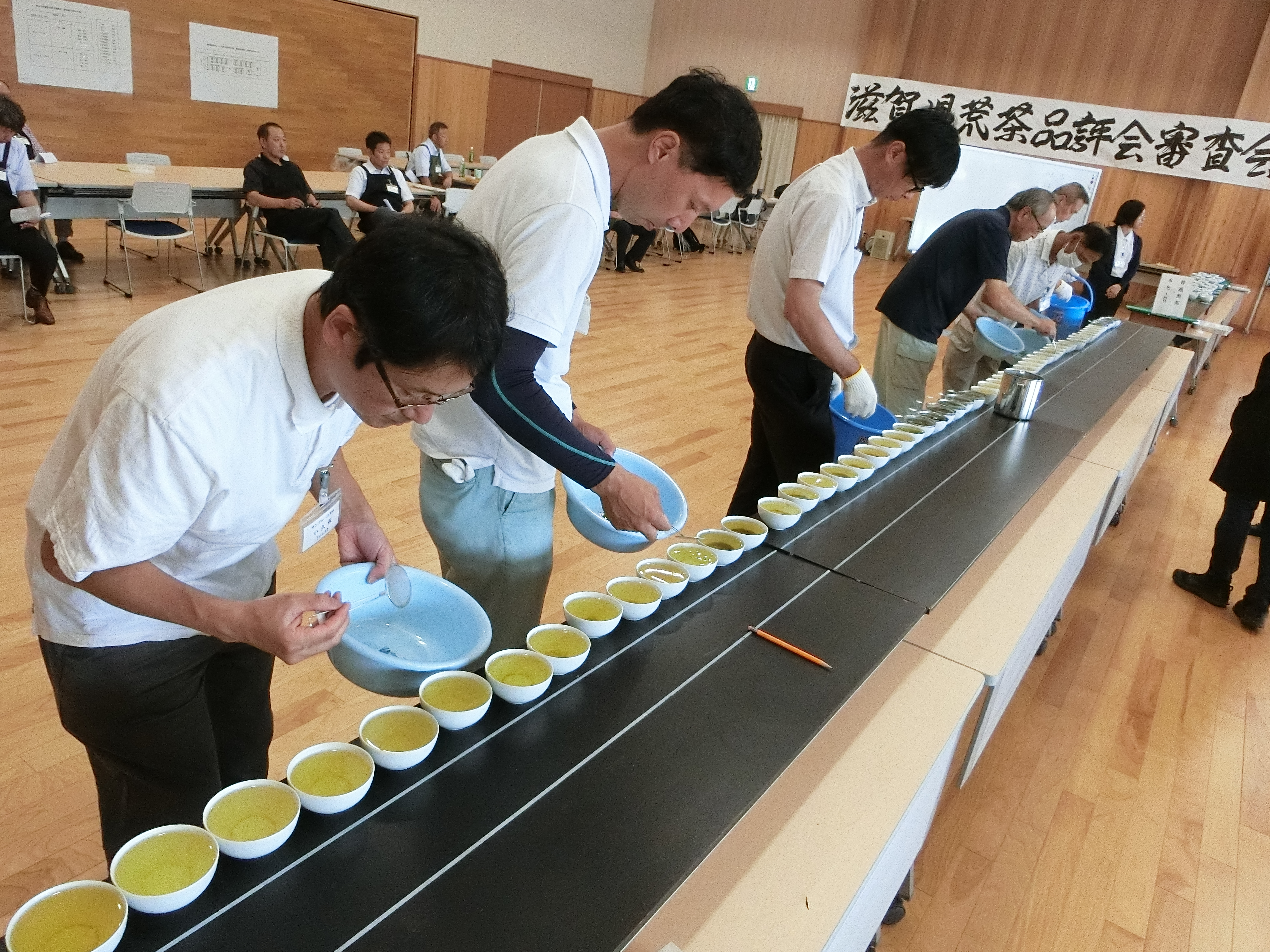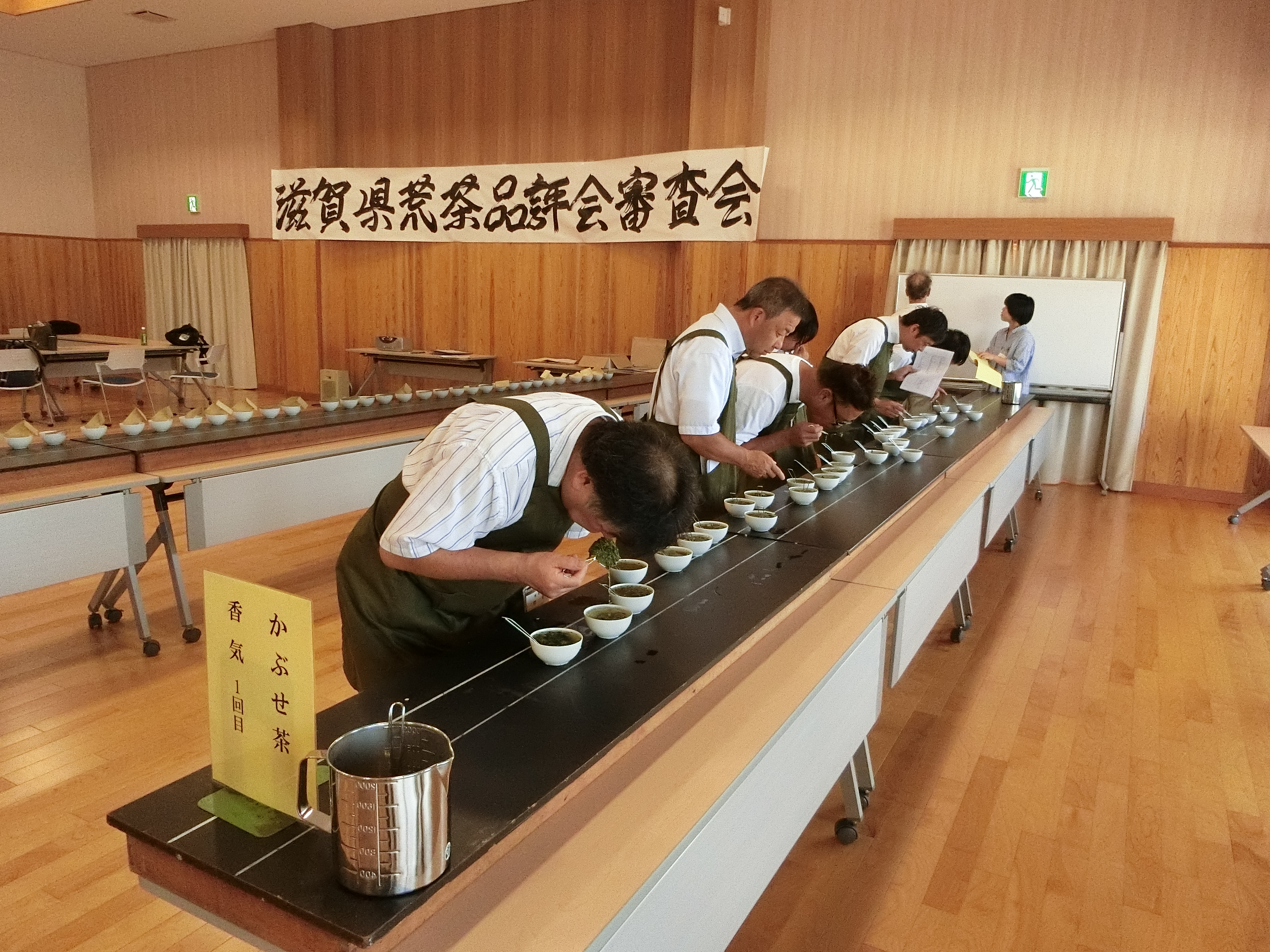 今年は甲賀市と蒲生郡日野町から煎茶117点、かぶせ茶62点の計179点とが出品され、14人の審査員により、香気、水色、滋味、外観について厳正に審査がされました。滋賀県では、以前から内質を重視する審査を行っていて、その配点も200点満点のうち香気65点、滋味65点、水色30点、外観40点となっています。