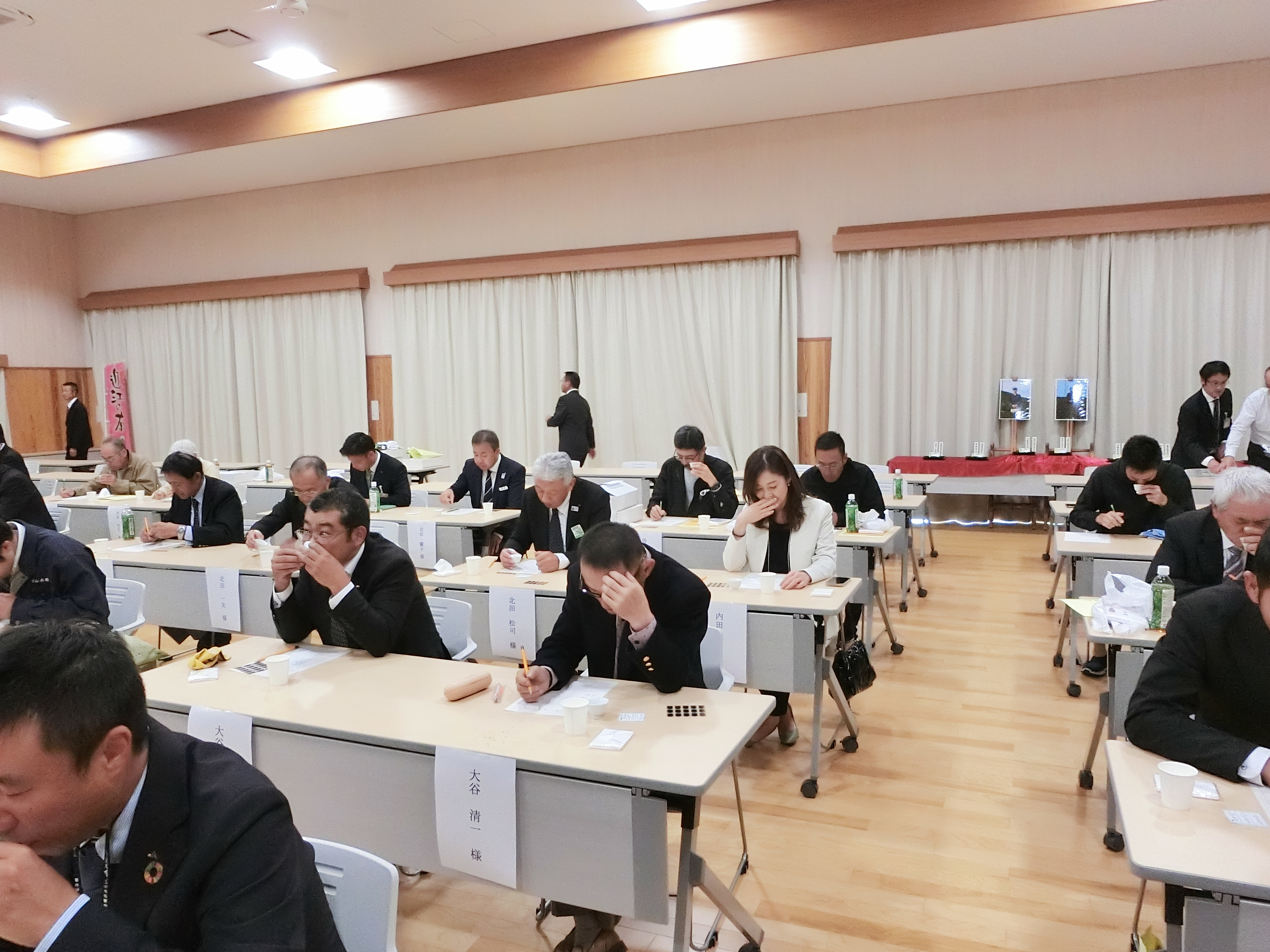 併せて、本年度は第2回目となる茶関係者全員による大闘茶会が開催されました。土山茶朝宮茶、とともに、伊勢茶、大和茶、宇治茶の5種煎茶で実施されました。茶生産者や茶商、関係者など約60人の参加者らが、予備審査として5産地の仕上げ茶の外観をチェックした後、本審査として煎出液を吟味。「茶のプロとして間違えられない」と、真剣な表情で産地の判定に挑んだ。審査は15点満点で行い、滋賀県茶業会議所の前野安司副会頭が「近隣の産地で、しかも煎茶での闘茶会ということで、非常に難しかったと思う。しかし、それぞれ産地の特色も、水色、滋味、香気に出ており、心を静めて味わえば、そこそこ推測のつくものであったと思う。他産地の茶も、飲むことによって自分の茶がわかることになり、こういった催しは必要」と審査講評した後、結果発表と表彰式を行った。結果発表の際には「やったー!」と声が上がる等、和やかな闘茶会となった。