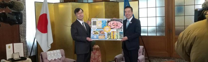 昨年、ノーベル生理学・医学賞を受賞された坂口志文さんは、滋賀県長浜市のご出身で、高校生の時まで長浜市で過ごされました。このご功績を称え、滋賀県では令和7年12月22日(月)、滋賀県庁において県民栄誉賞授与式が執り行われました。授与式では、三日月大造滋賀県知事から賞状および記念トロフィーが贈呈され、副賞として「近江の茶」「近江米」「近江牛」「湖魚詰め合わせ」が贈られました。このうち「近江の茶」については、滋賀県の統一ブランドとして販売している「極煎茶比叡(きわみせんちゃひえい)」と「琵琶湖かぶせ」の詰め合わせセットを贈りました。